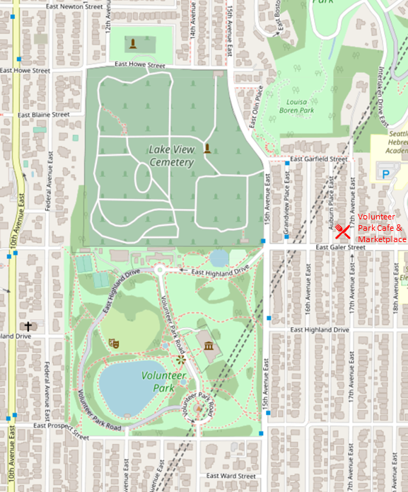 These food options are near Volunteer Park (.1 miles or closer). Hover on an option to see its food style and click the option to open its menu.