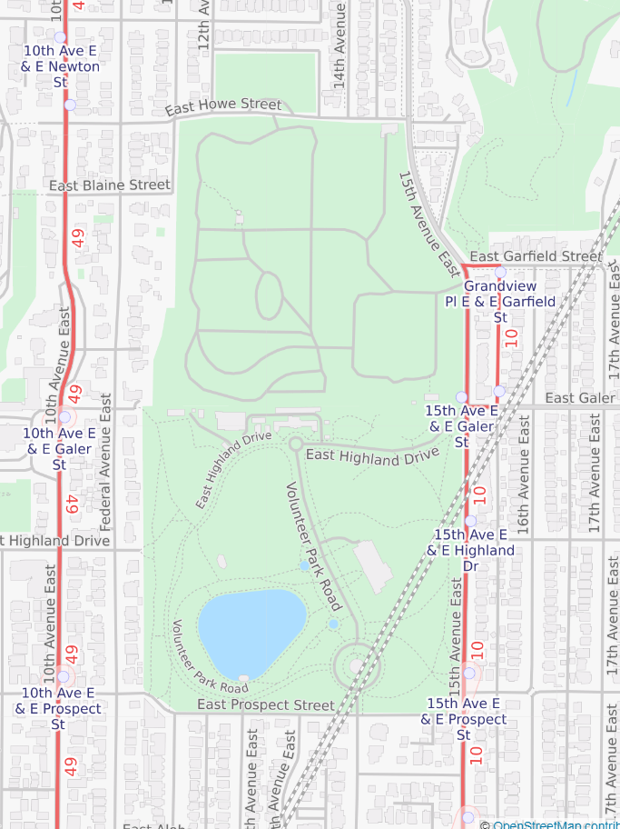 These public transit routes stop near Volunteer Park (.1 miles or closer). Hover on a route to see its details and click a route to open its schedule.